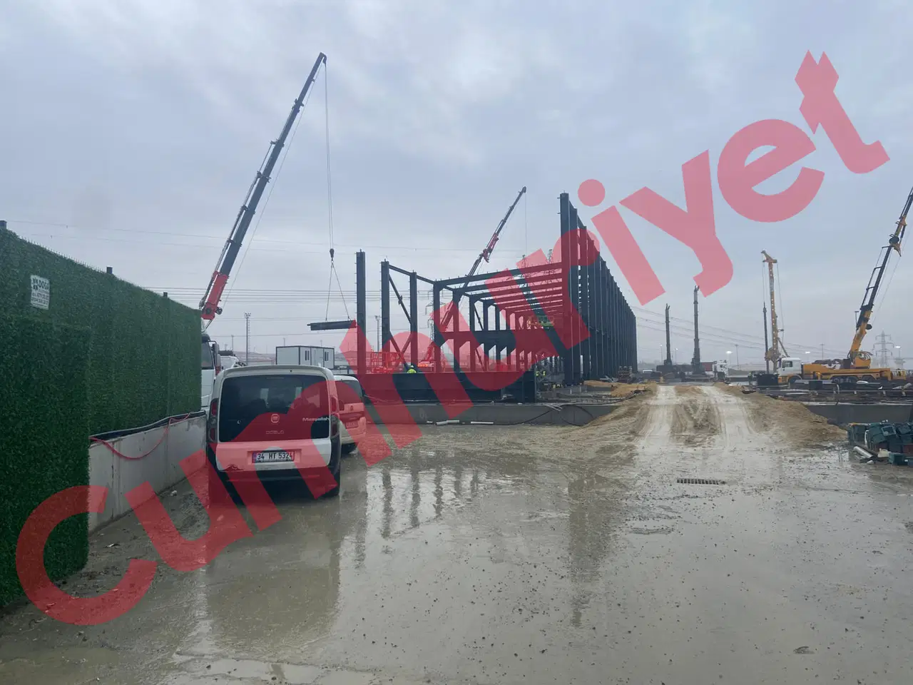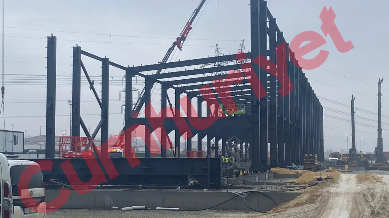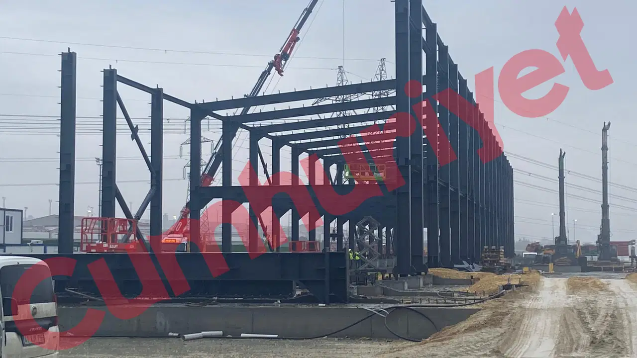 Zemine dökülen beton temelin yanı sıra; geniş bir alana çelik konstrüksiyon bir yapının taşıyıcı iskeletinin inşa edildiği görülüyor.